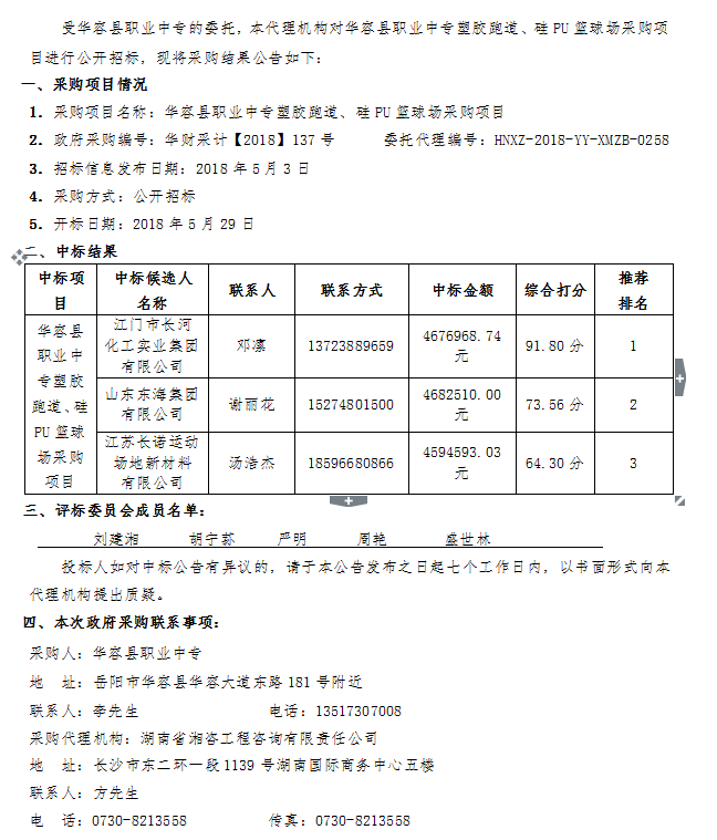 華容縣職業(yè)中專塑膠跑道、硅PU籃球場(chǎng)采購(gòu)項(xiàng)目公開(kāi)招標(biāo)中標(biāo)公告