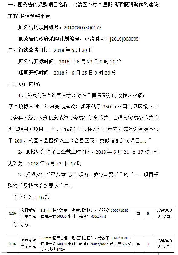雙清區(qū)農(nóng)村基層防汛預(yù)報(bào)預(yù)警體系建設(shè)工程-監(jiān)測預(yù)警平臺公開招標(biāo)更正公告
