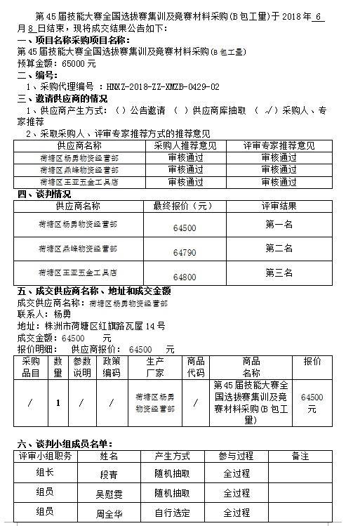 第45屆技能大賽全國選拔賽集訓(xùn)及競賽材料采購 (B包工量) 競爭性談判成交公告