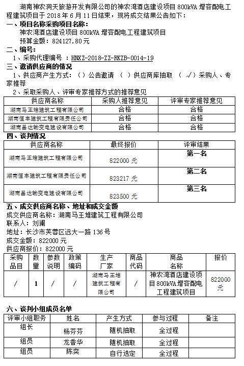 神農(nóng)灣酒店建設(shè)項(xiàng)目800kVA增容配電工程建筑項(xiàng)目 競爭性談判成交公告