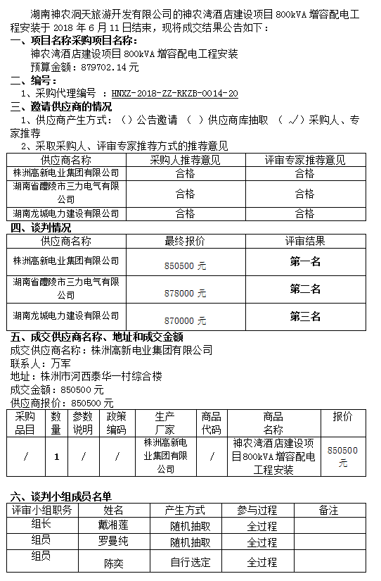 神農(nóng)灣酒店建設(shè)項目800kVA增容配電工程安裝  競爭性談判成交公告
