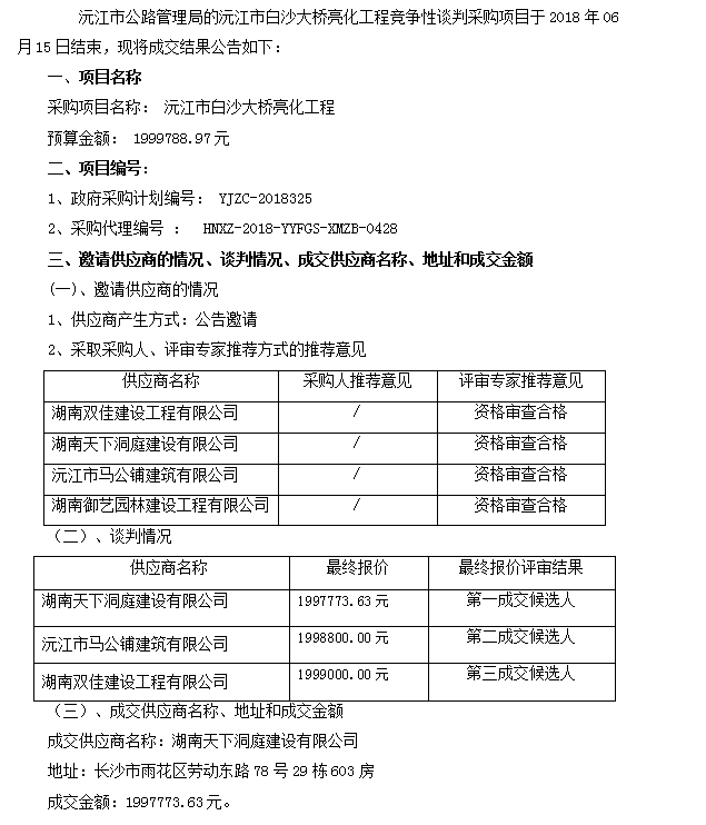 沅江市公路管理局的沅江市白沙大橋亮化工程競爭性談判成交結(jié)果公告