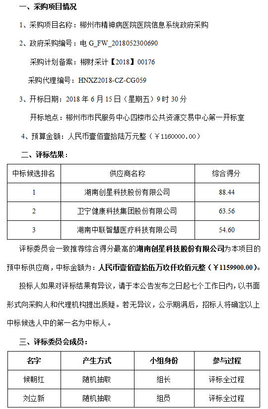郴州市精神病醫(yī)院醫(yī)院信息系統(tǒng)政府采購 中標結果公示