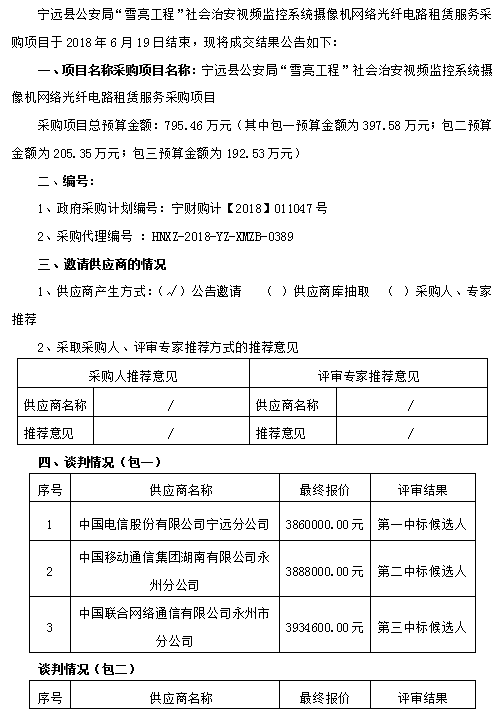 寧遠(yuǎn)縣公安局“雪亮工程”社會(huì)治安視頻監(jiān)控系統(tǒng) 攝像機(jī)網(wǎng)絡(luò)光纖電路租賃服務(wù)采購(gòu)項(xiàng)目 競(jìng)爭(zhēng)性談判成交結(jié)果公告