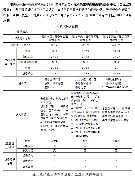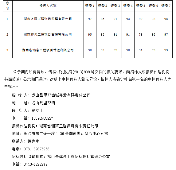 龍山縣里耶古城南游客服務(wù)中心(含拆遷安置區(qū))二期工程監(jiān)理 招標(biāo)投標(biāo)信息公示表