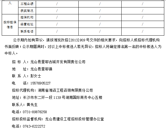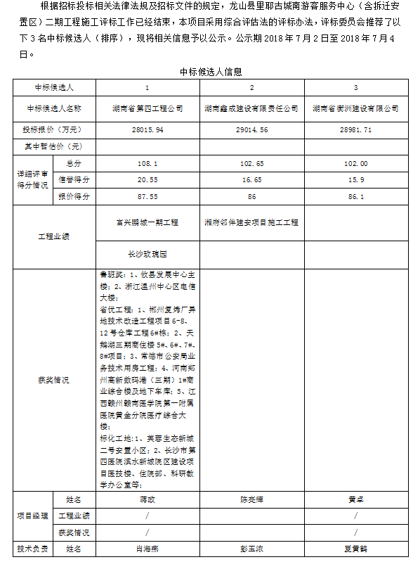 龍山縣里耶古城南游客服務(wù)中心(含拆遷安置區(qū))二期工程 招標(biāo)投標(biāo)信息公示表
