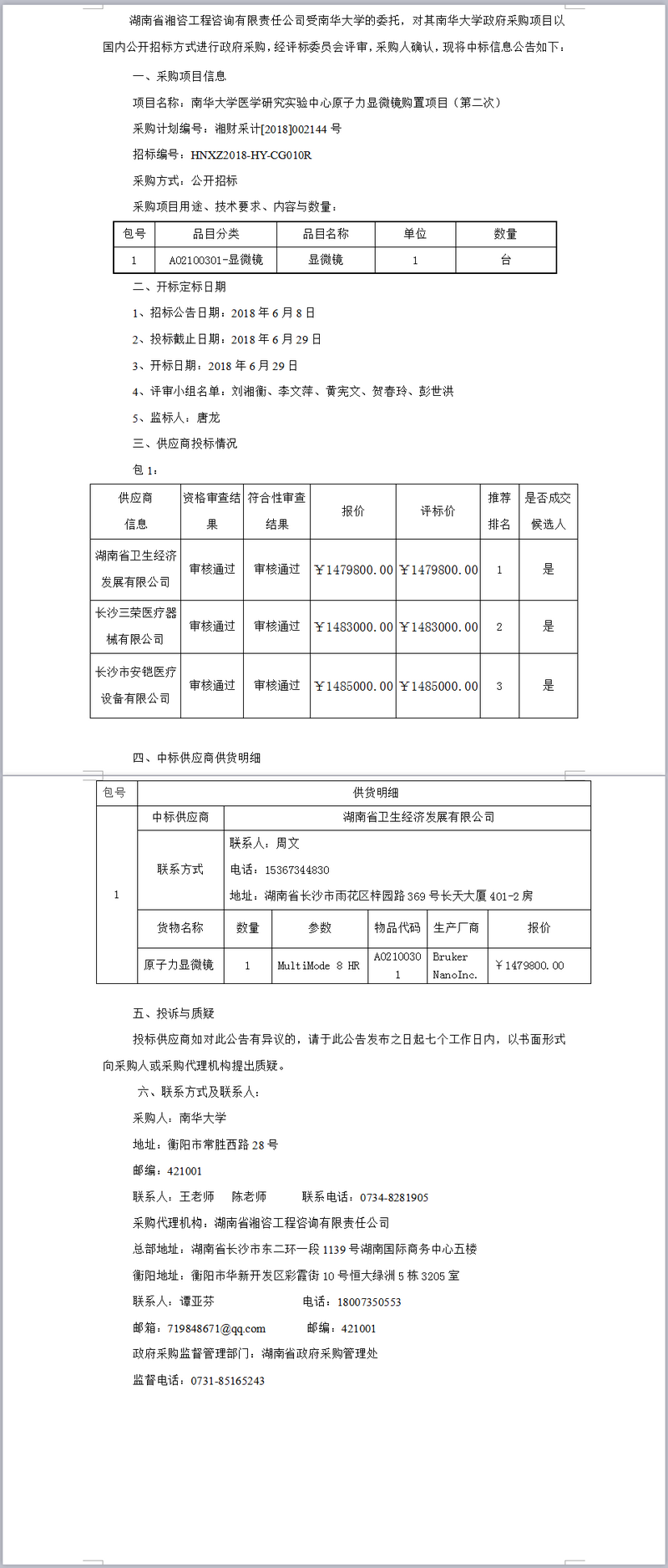 南華大學醫(yī)學研究實驗中心原子力顯微鏡購置項目(第二次)中標公告