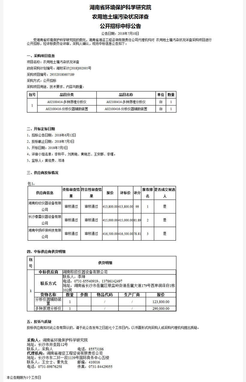 湖南省環(huán)境保護(hù)科學(xué)研究院農(nóng)用地土壤污染狀況詳查公開招標(biāo)中標(biāo)公告