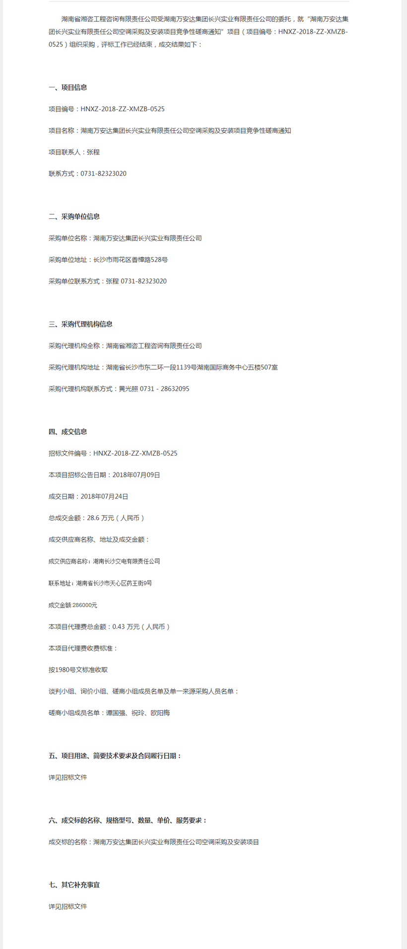 湖南萬安達(dá)集團(tuán)長興實(shí)業(yè)有限責(zé)任公司空調(diào)采購及安裝項(xiàng)目競爭性磋商通知成交公告