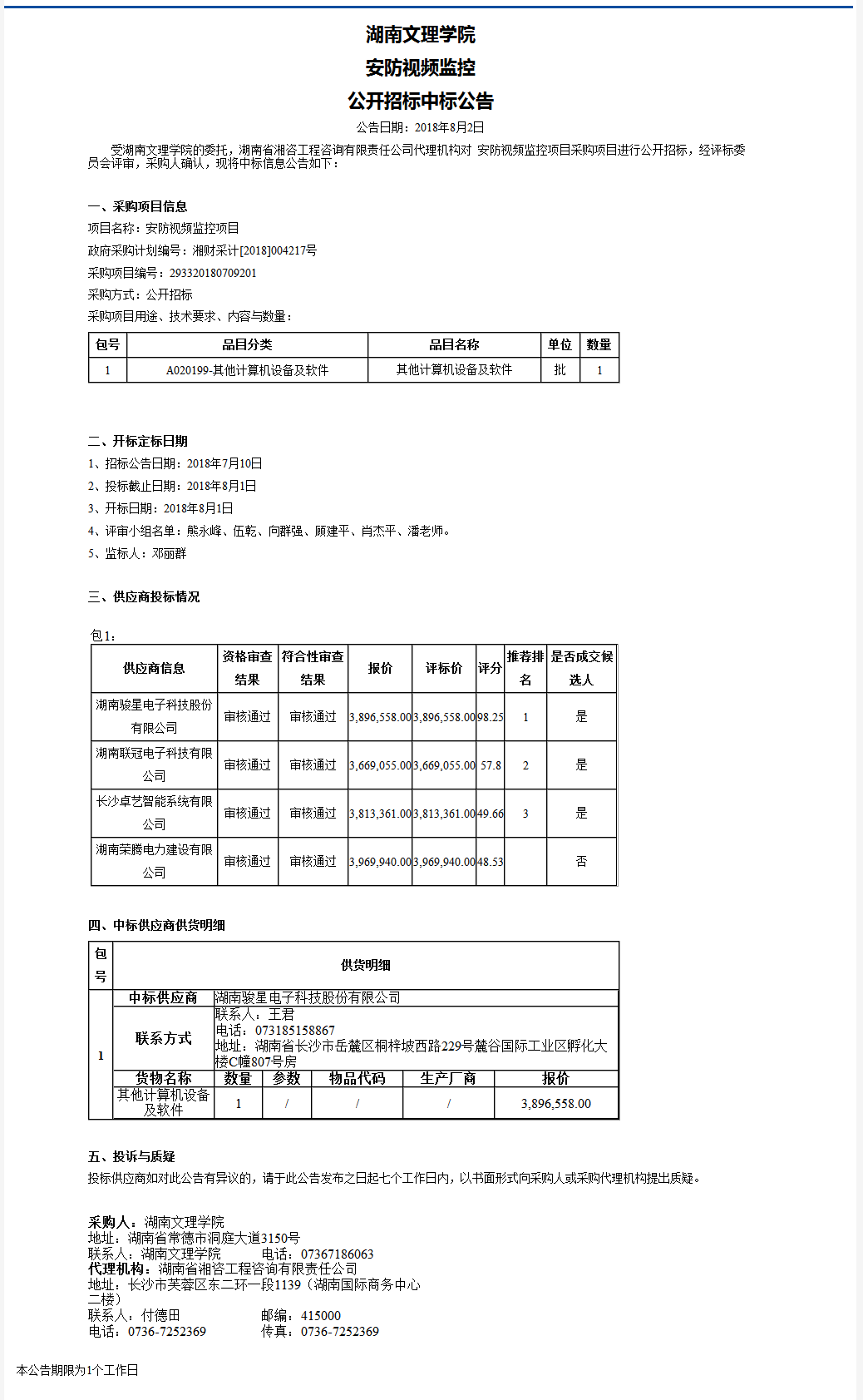 湖南文理學(xué)院安防視頻監(jiān)控公開招標中標公告