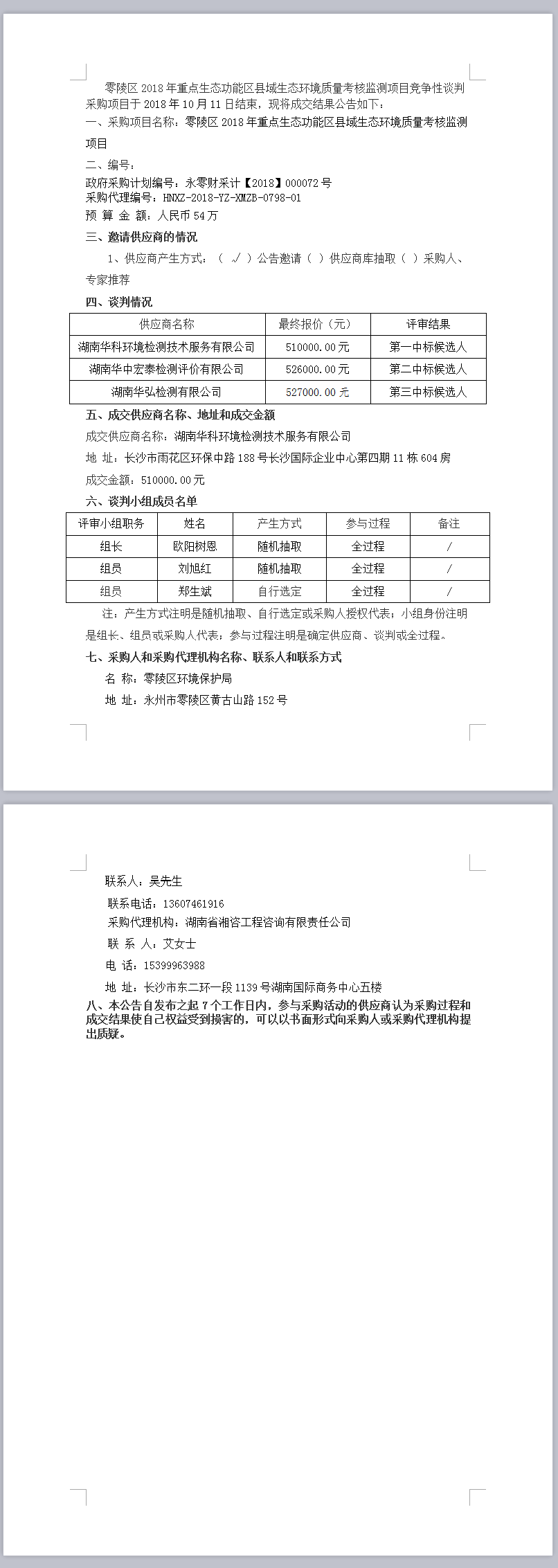零陵區(qū)2018年重點生態(tài)功能區(qū)縣域生態(tài)環(huán)境質(zhì)量考核監(jiān)測項目 競爭性談判成交公告