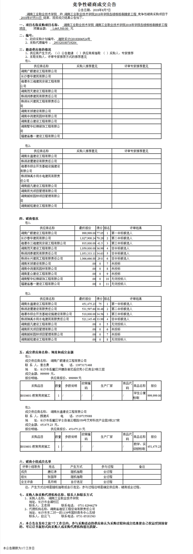 湖南工業(yè)職業(yè)技術(shù)學院湖南工業(yè)職業(yè)技術(shù)學院2018年學院各樓棟粉刷維修工程項目競爭性磋商成交公告