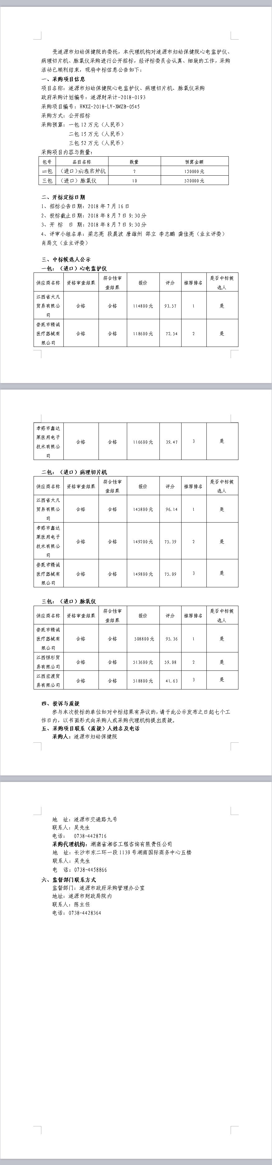 漣源市婦幼保健院心電監(jiān)護儀、病理切片機、脈氧儀采購 中標結(jié)果公告