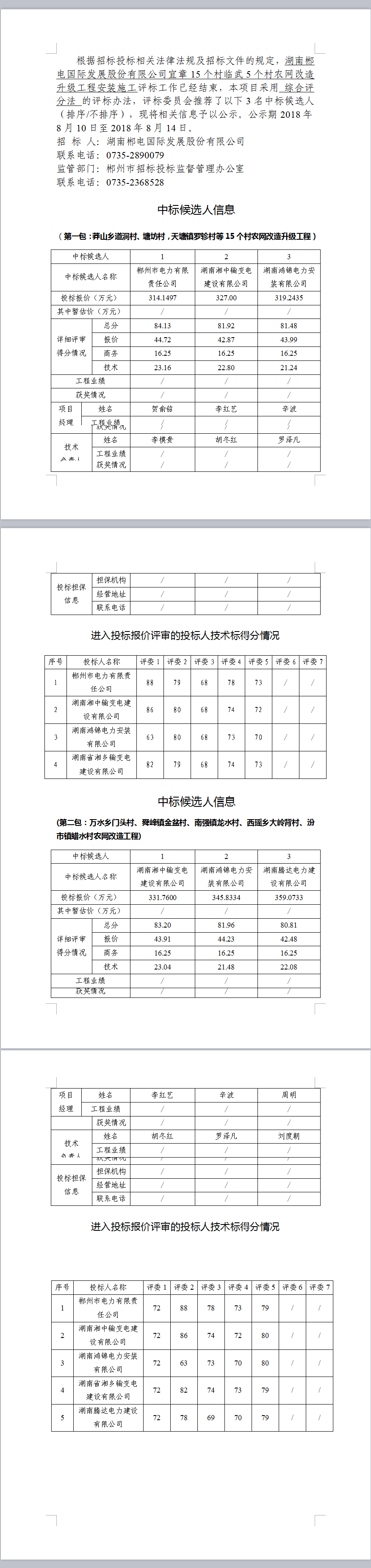 湖南郴電國際發(fā)展股份有限公司宜章15個村臨武5個村農(nóng)網(wǎng)改造升級工程安裝施工中標候選人公示