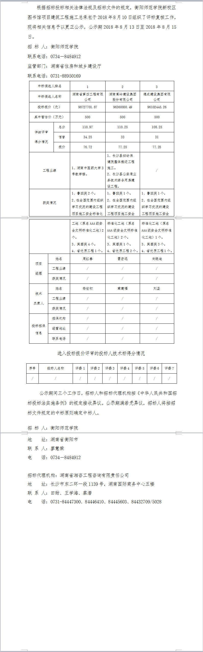 衡陽師范學院新校區(qū)圖書館項目建筑工程施工總承包招標投標信息公示表更正公示
