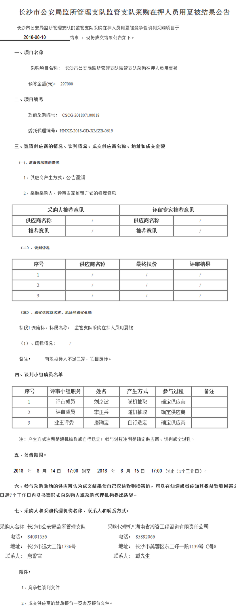 長(zhǎng)沙市公安局監(jiān)所管理支隊(duì)監(jiān)管支隊(duì)采購(gòu)在押人員用夏被結(jié)果公告