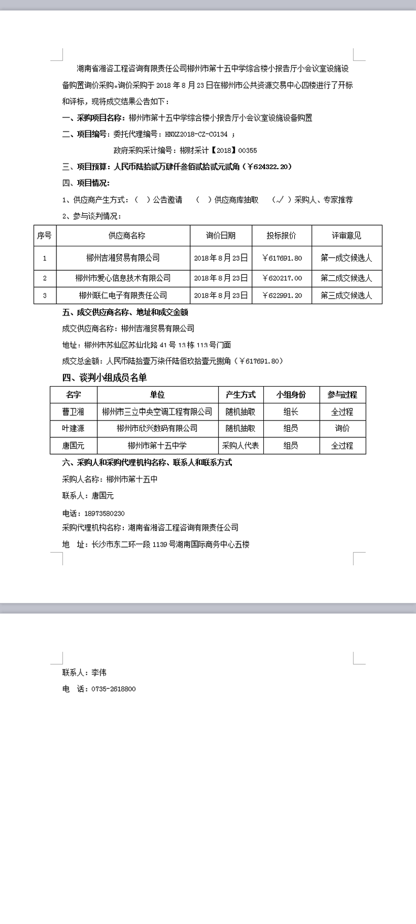 郴州市第十五中學(xué)綜合樓小報(bào)告廳小會議室設(shè)施設(shè)備購置詢價采購成交公告