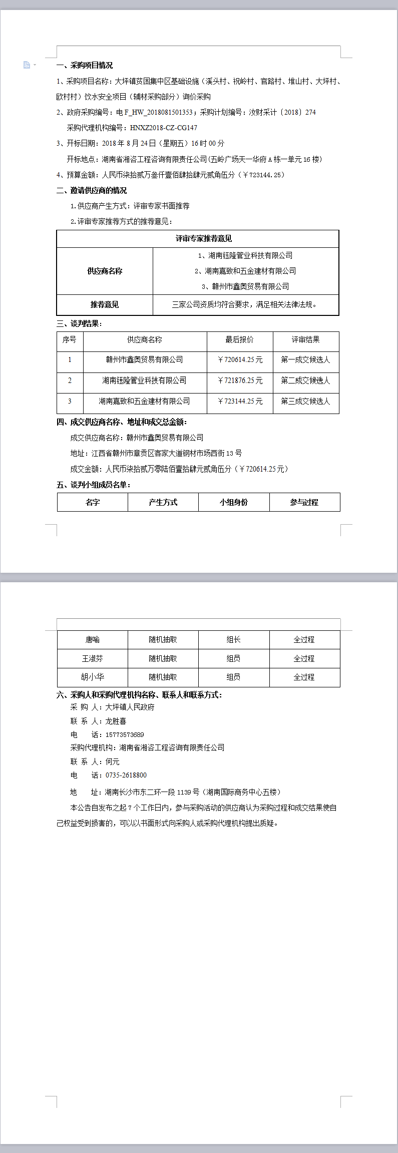 大坪鎮(zhèn)貧困集中區(qū)基礎(chǔ)設(shè)施(溪頭村、祝嶺村、官路村、堆山村、大坪村、歐村村)飲水安全項(xiàng)目(輔材采購部分)詢價采購成交公告