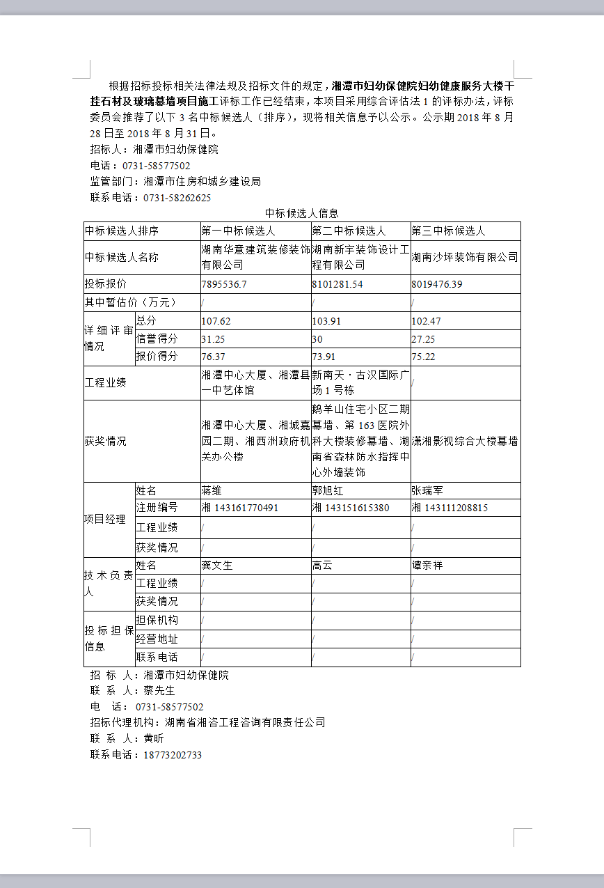 湘潭市婦幼保健院婦幼健康服務大樓干掛石材及玻璃幕墻項目施工中標候選人公示