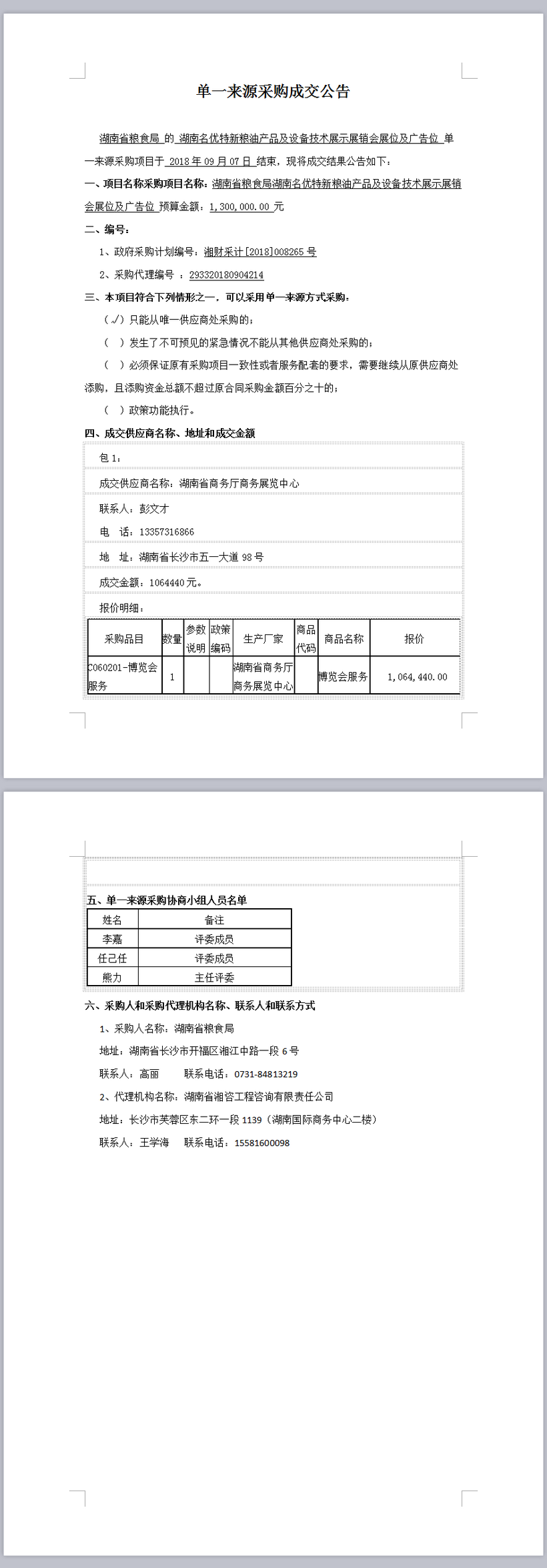 湖南省糧食局湖南名優(yōu)特新糧油產(chǎn)品及設(shè)備技術(shù)展示展銷會展位及廣告位單一來源采購成交公告