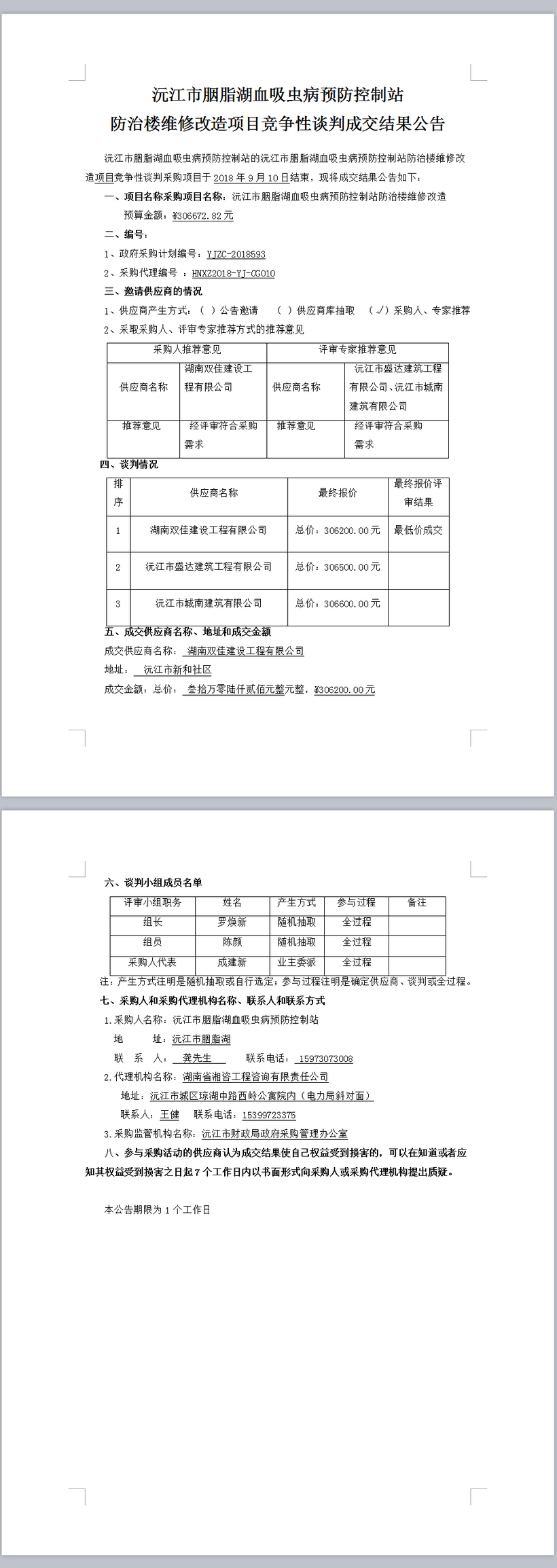 沅江市胭脂湖血吸蟲病預(yù)防控制站防治樓維修改造項目競爭性談判成交結(jié)果公告