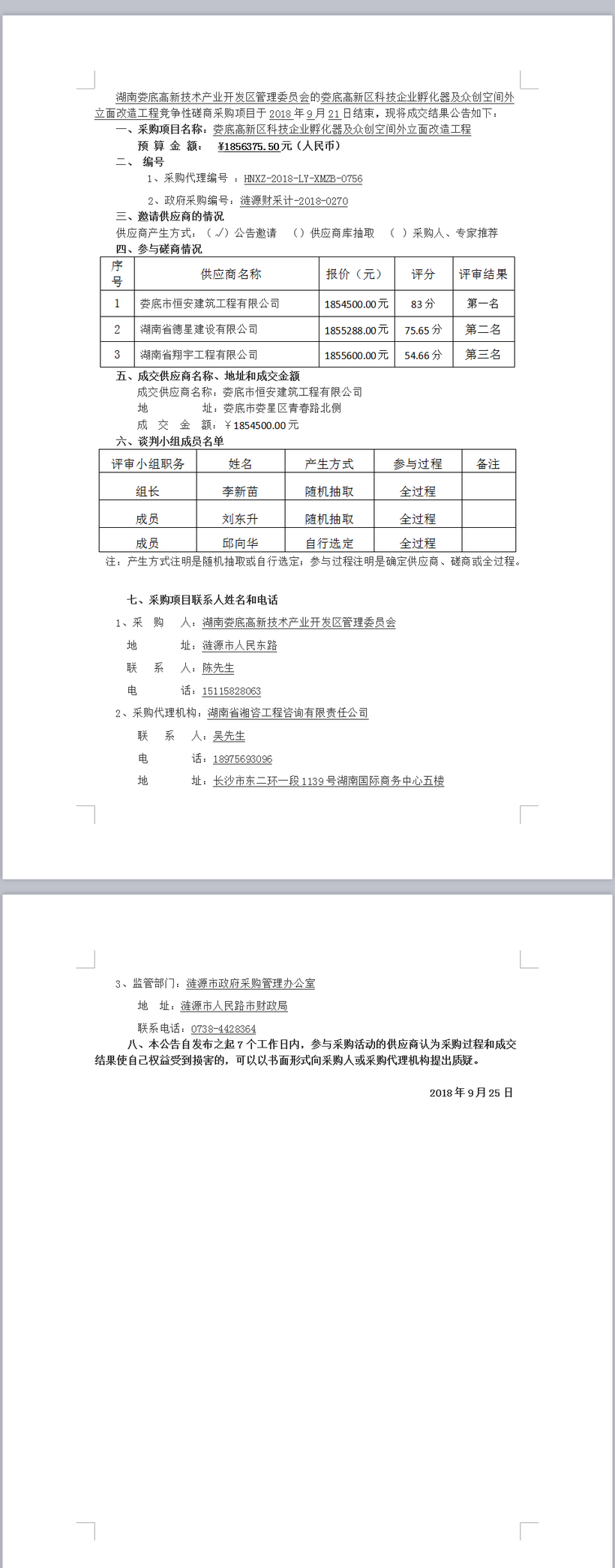 婁底高新區(qū)科技企業(yè)孵化器及眾創(chuàng)空間外立面改造工程競(jìng)爭(zhēng)性磋商成交公告