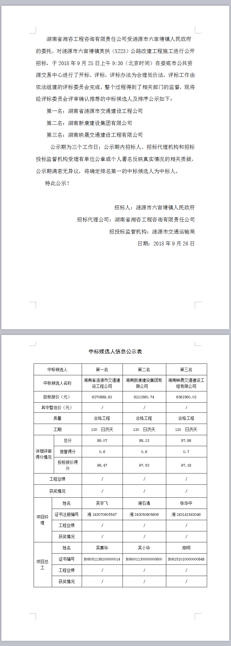 漣源市六畝塘鎮(zhèn)芙扶(X223)公路改建工程施工中標候選人公示