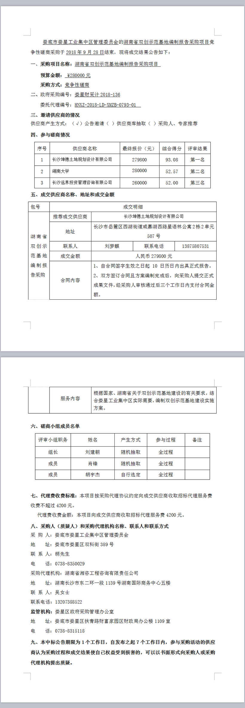 湖南省雙創(chuàng)示范基地編制報告采購項目競爭性磋商成交結果公告