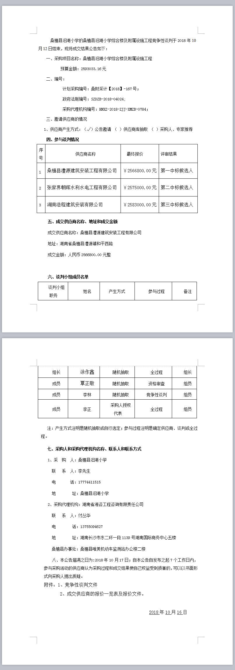 桑植縣汨湖小學(xué)綜合樓及附屬設(shè)施工程談判成交公告