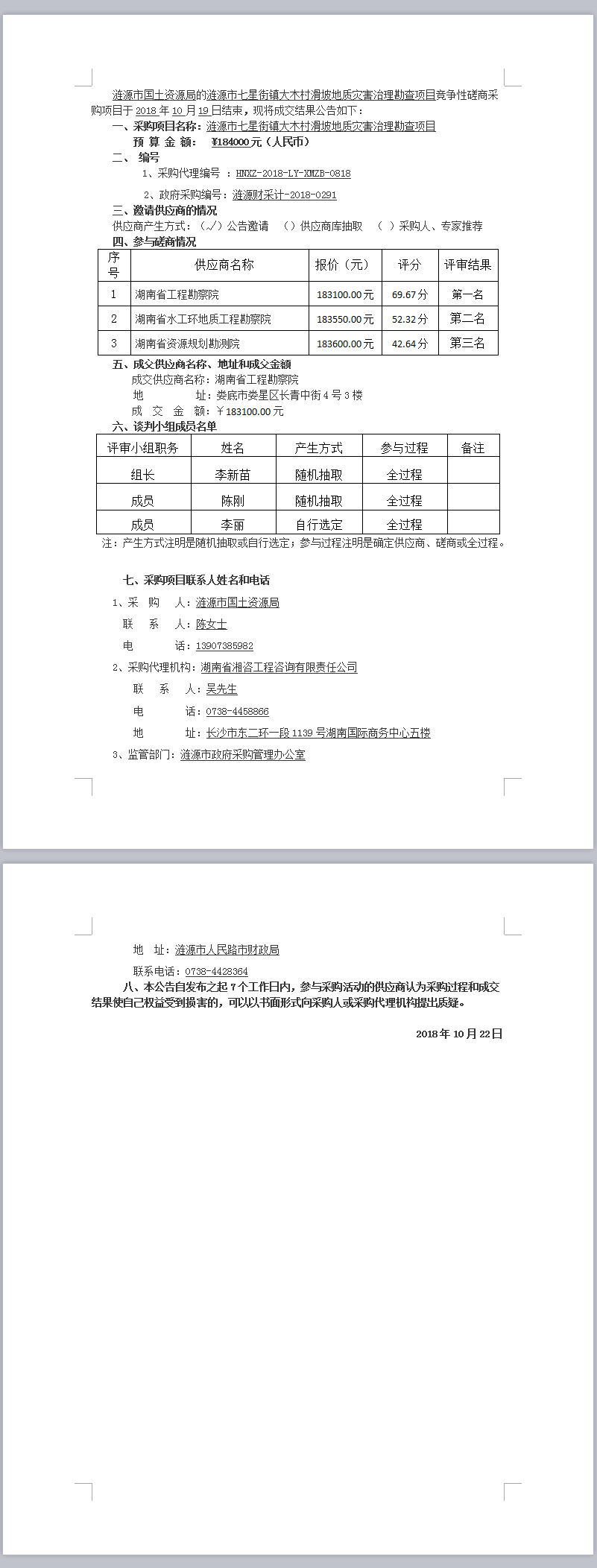 漣源市七星街鎮(zhèn)大木村滑坡地質災害治理勘查項目競爭性磋商成交結果公告