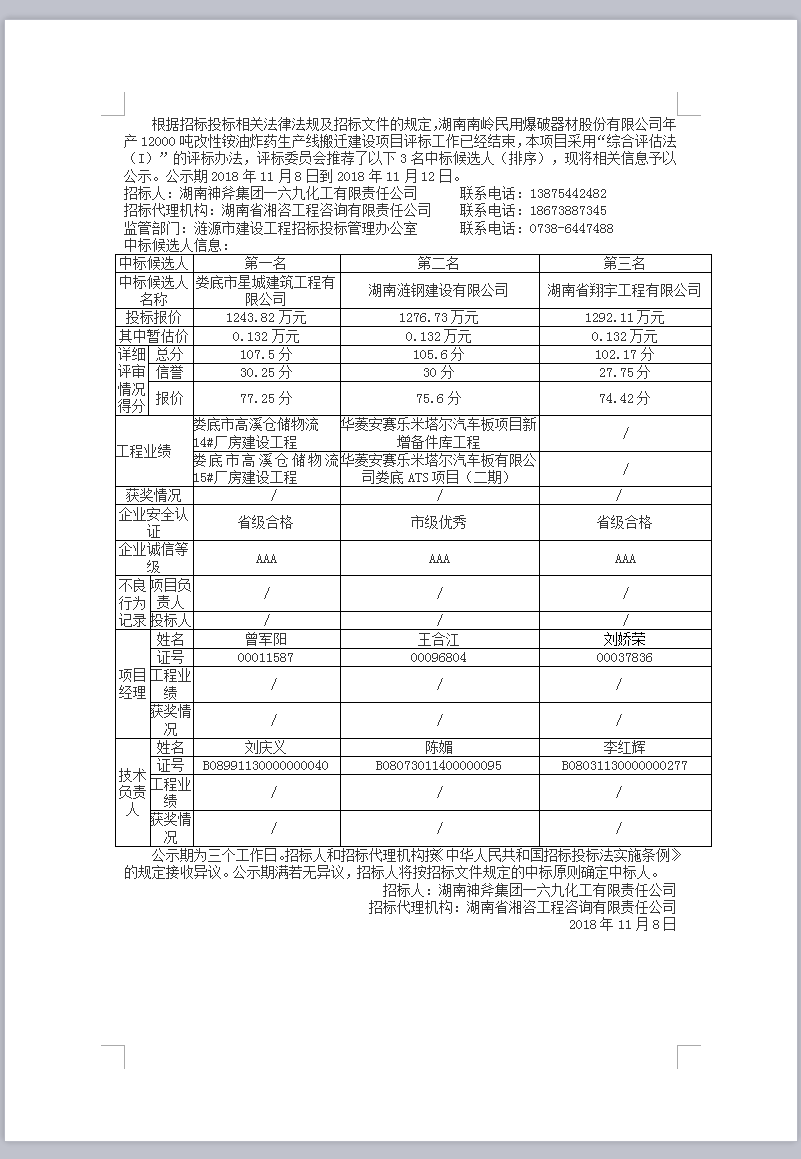 湖南南嶺民用爆破器材股份有限公司年產(chǎn)12000噸改性銨油炸藥生產(chǎn)線搬遷建設項目中標候選人公示