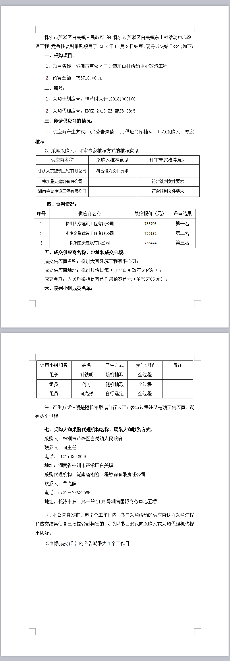 株洲市蘆淞區(qū)白關鎮(zhèn)東山村活動中心改造工程談判成交公告