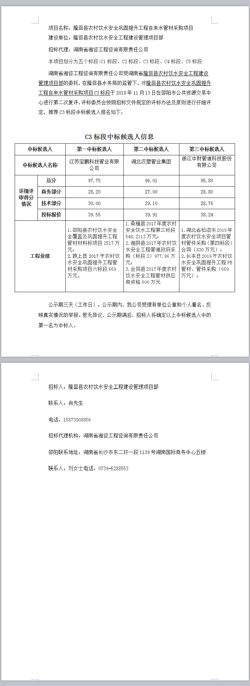 隆回縣農(nóng)村飲水安全鞏固提升工程自來水管材采購項目C3標段招標投標信息公示表 (第二次復(fù)評)