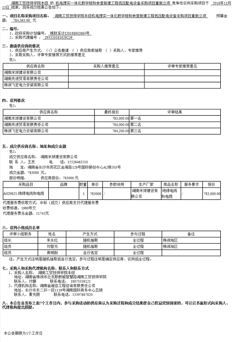 湖南工貿(mào)技師學(xué)院本級機電理實一體化教學(xué)樓和食堂新建工程低壓配電設(shè)備采購項目競爭性談判成交公告