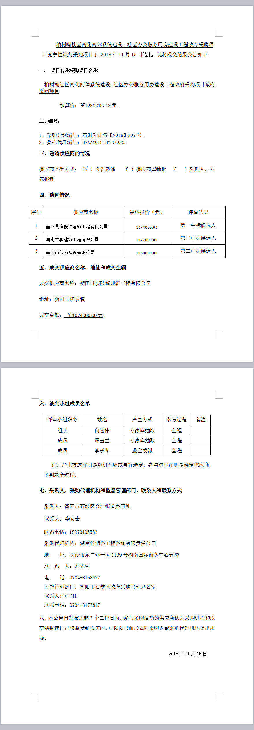 柏樹嘴社區(qū)兩化兩體系統(tǒng)建設(shè):社區(qū)辦公服務(wù)用房建設(shè)工程政府 采購項目談判成交公告
