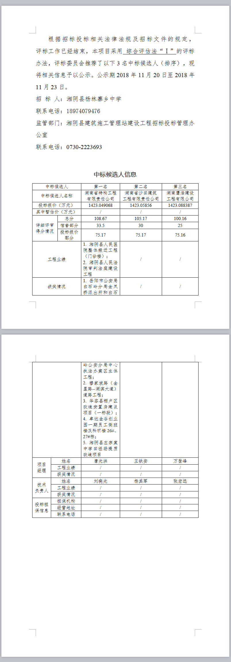 湘陰縣楊林寨中學(xué)改擴(kuò)建項(xiàng)目施工招標(biāo)投標(biāo)信息公示表