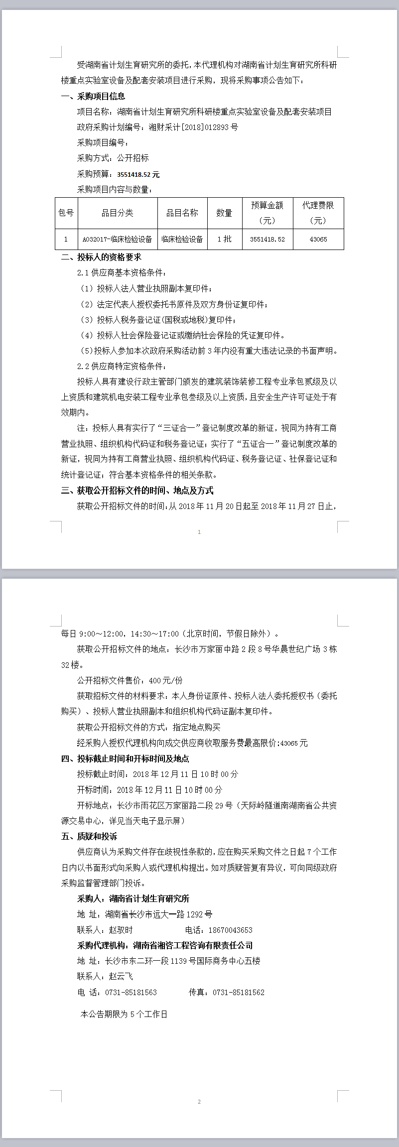 湖南省計(jì)劃生育研究所科研樓重點(diǎn)實(shí)驗(yàn)室 設(shè)備及配套安裝項(xiàng)目公開招標(biāo)公告