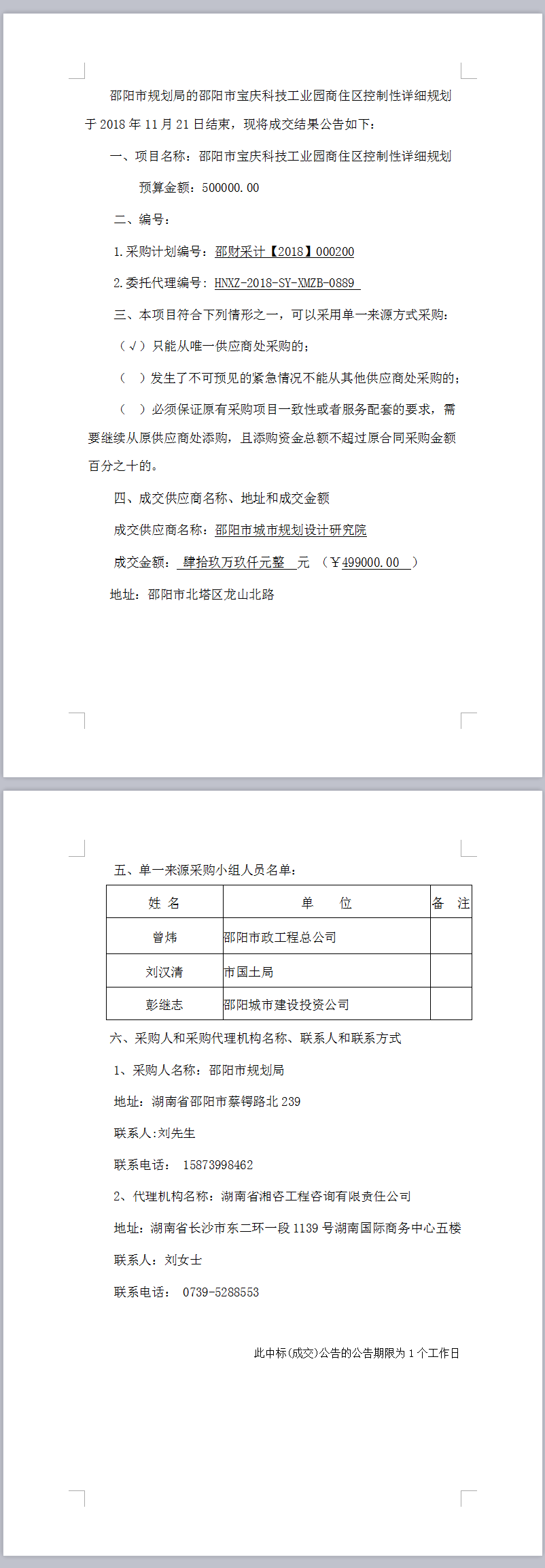 邵陽市寶慶科技工業(yè)園商住區(qū)控制性詳細規(guī)劃采購項目單一來源成交公告
