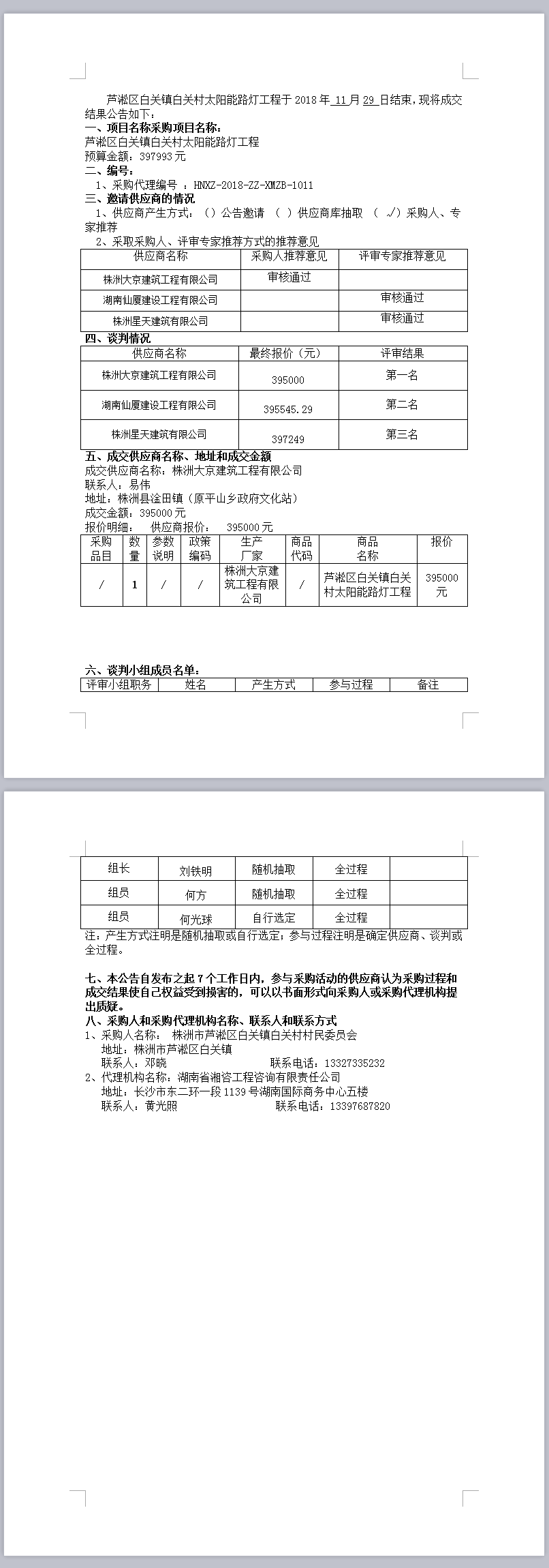 蘆淞區(qū)白關(guān)鎮(zhèn)白關(guān)村太陽能路燈工程 競(jìng)爭(zhēng)性談判成交公告
