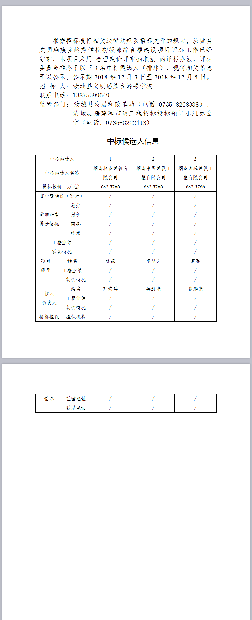 汝城縣文明瑤族鄉(xiāng)嶺秀學(xué)校初級(jí)部綜合樓建設(shè)項(xiàng)目中標(biāo)候選人公示