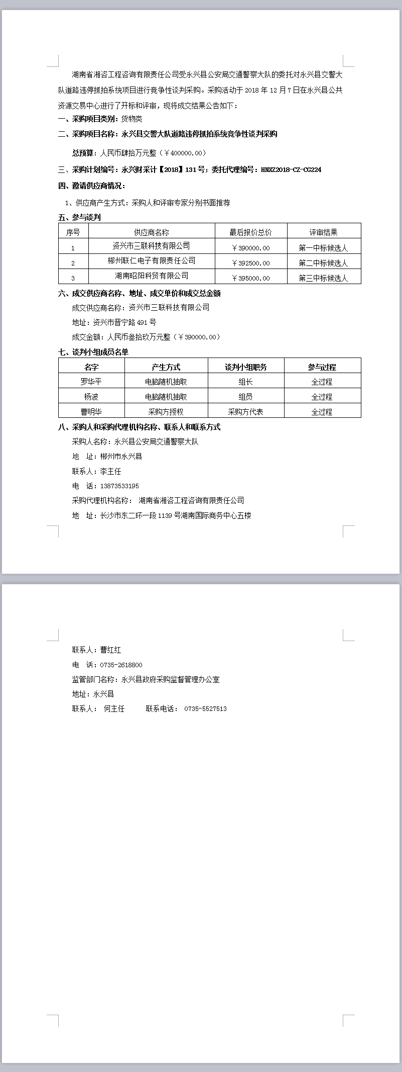 永興縣交警大隊道路違停抓拍系統(tǒng)競爭性談判采購成交公告