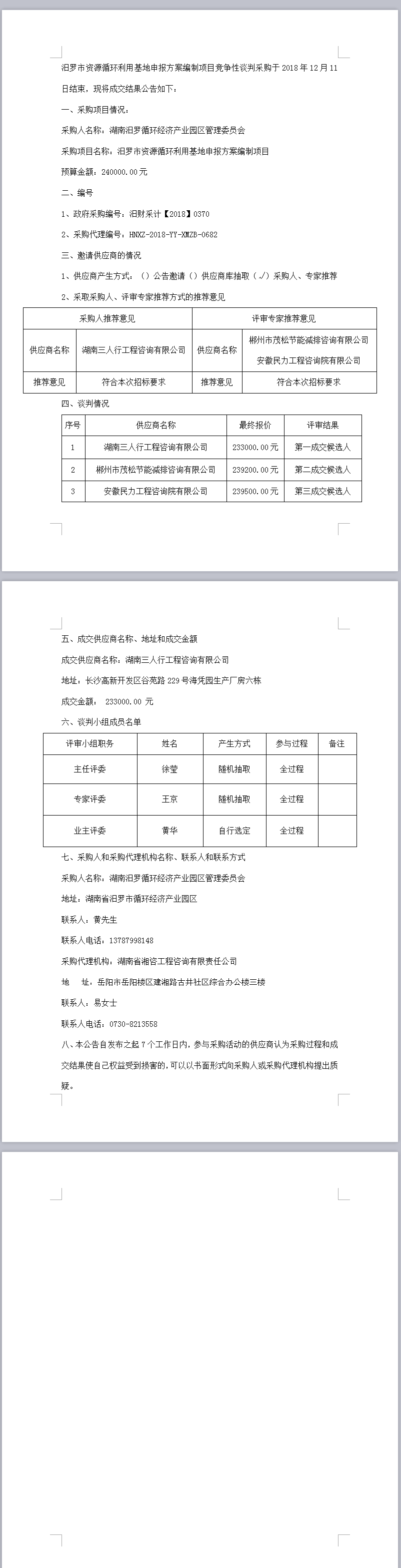 湖南汨羅循環(huán)經(jīng)濟(jì)產(chǎn)業(yè)園區(qū)管理委員會競爭性談判成交結(jié)果公告