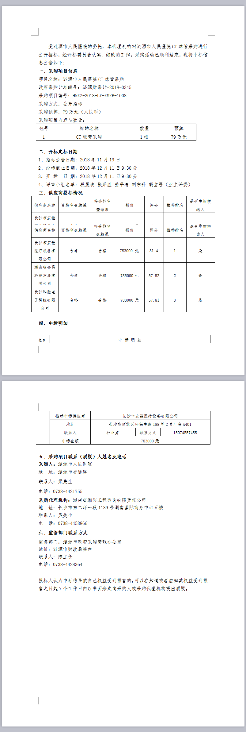漣源市人民醫(yī)院CT球管采購中標(biāo)結(jié)果公告