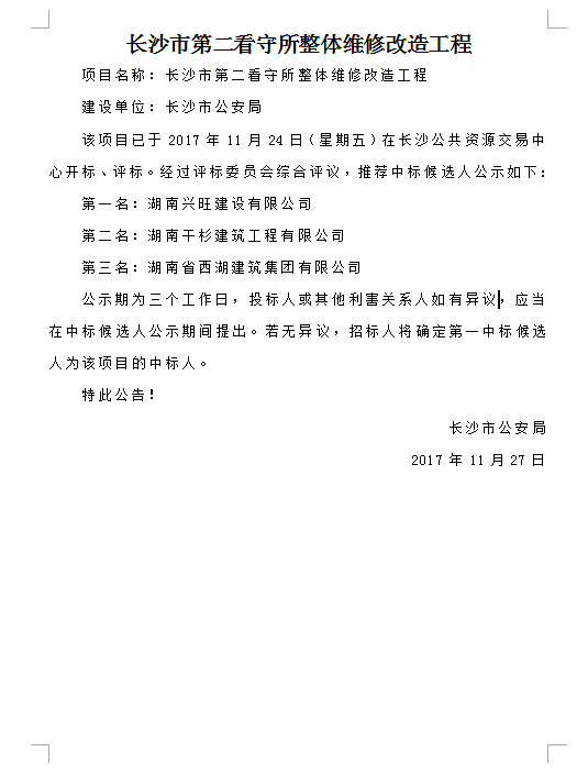 長(zhǎng)沙市第二看守所整體維修改造工程中標(biāo)候選人公示