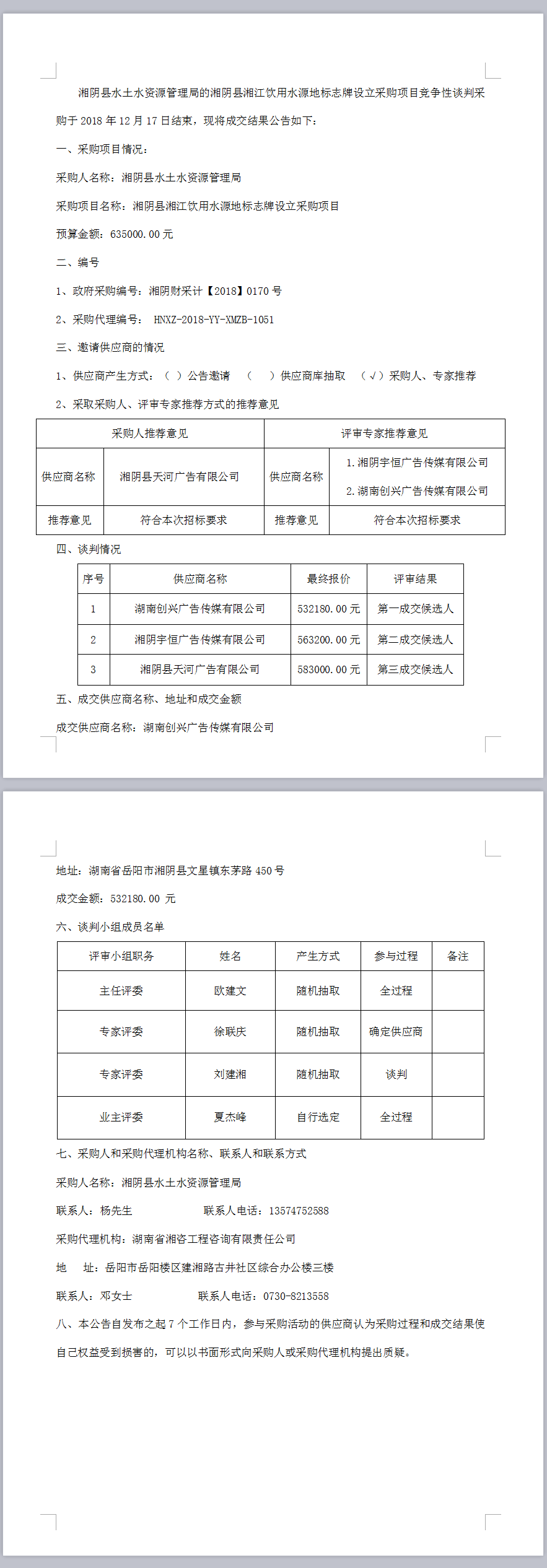 湘陰縣湘江飲用水源地標(biāo)志牌設(shè)立采購項目 競爭性談判成交結(jié)果公告