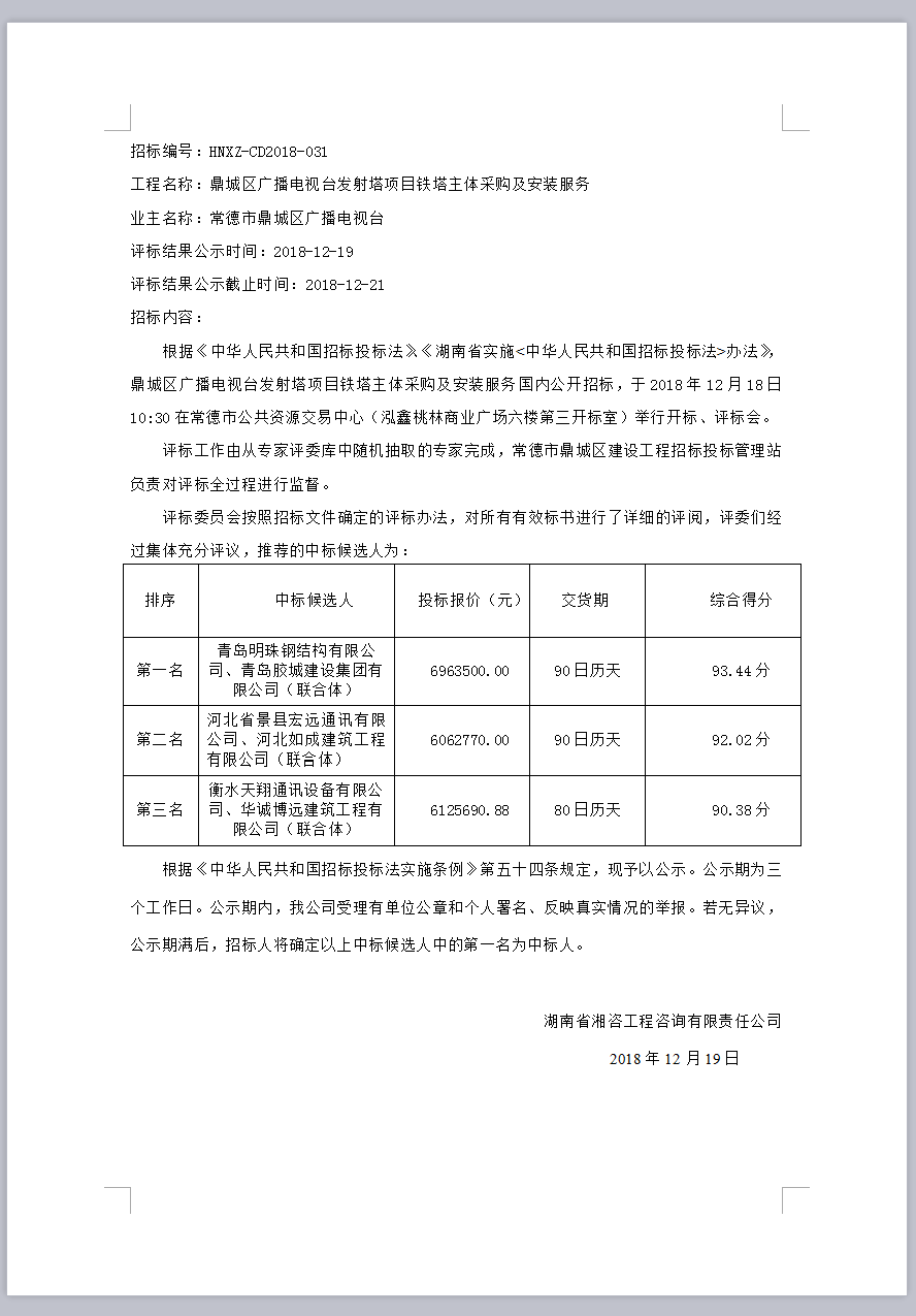 鼎城區(qū)廣播電視臺發(fā)射塔項(xiàng)目鐵塔主體采購及安裝服務(wù)中標(biāo)候選人公示
