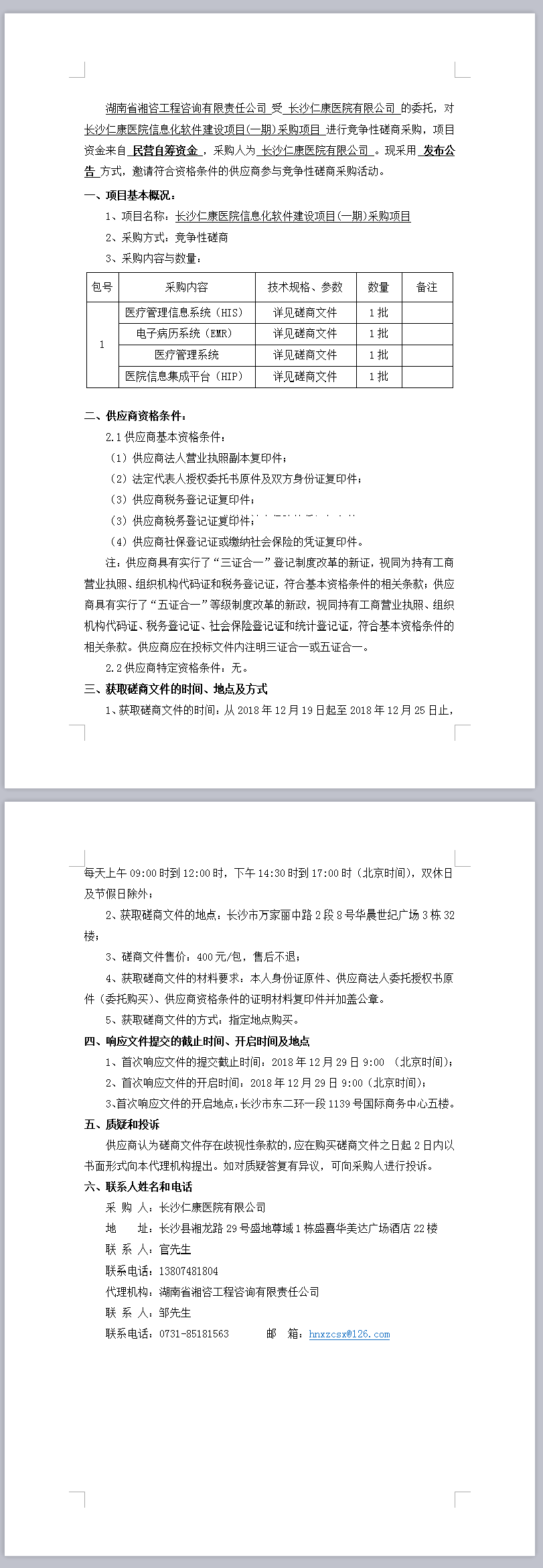 長沙仁康醫(yī)院信息化軟件建設(shè)項目(一期)采購項目磋商邀請公告