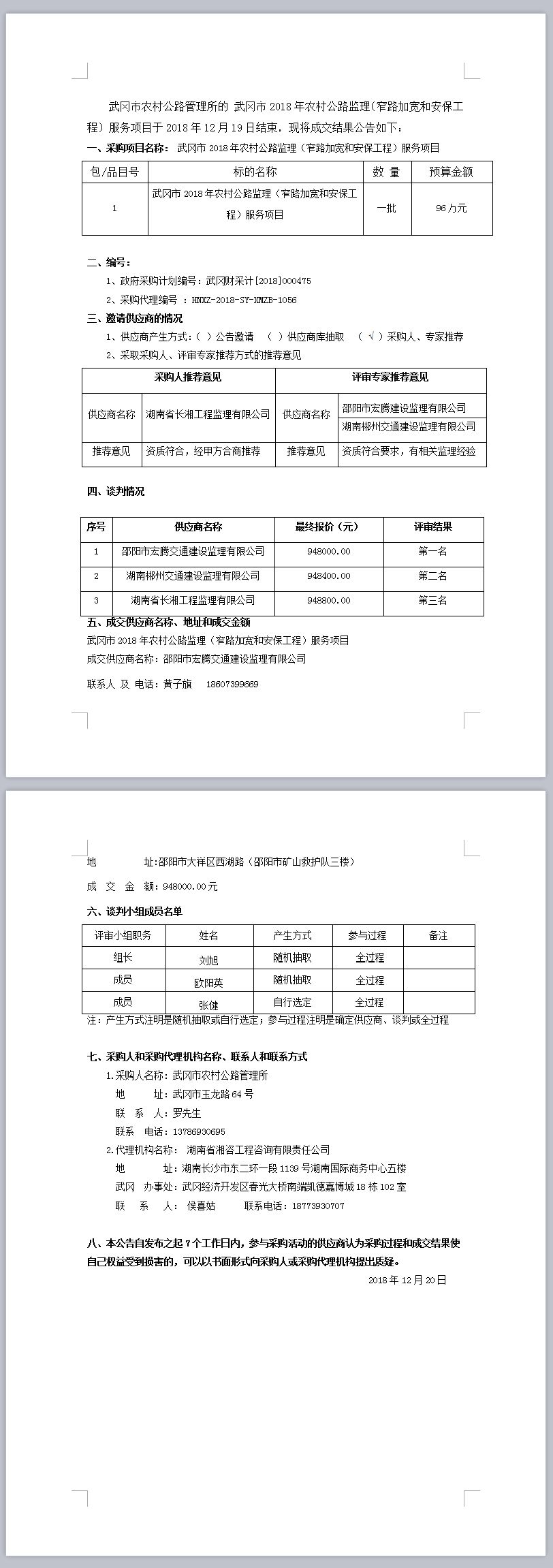 武岡市2018年農(nóng)村公路監(jiān)理(窄路加寬和安保工程)服務項目采購 競爭性談判成交結果公告