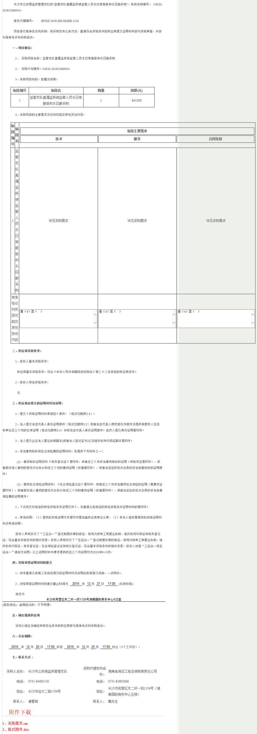 長沙市公安局監(jiān)所管理支隊監(jiān)管支隊直屬監(jiān)所被監(jiān)管人員冬日常服裝和冬囚服采購競爭性談判邀請公告