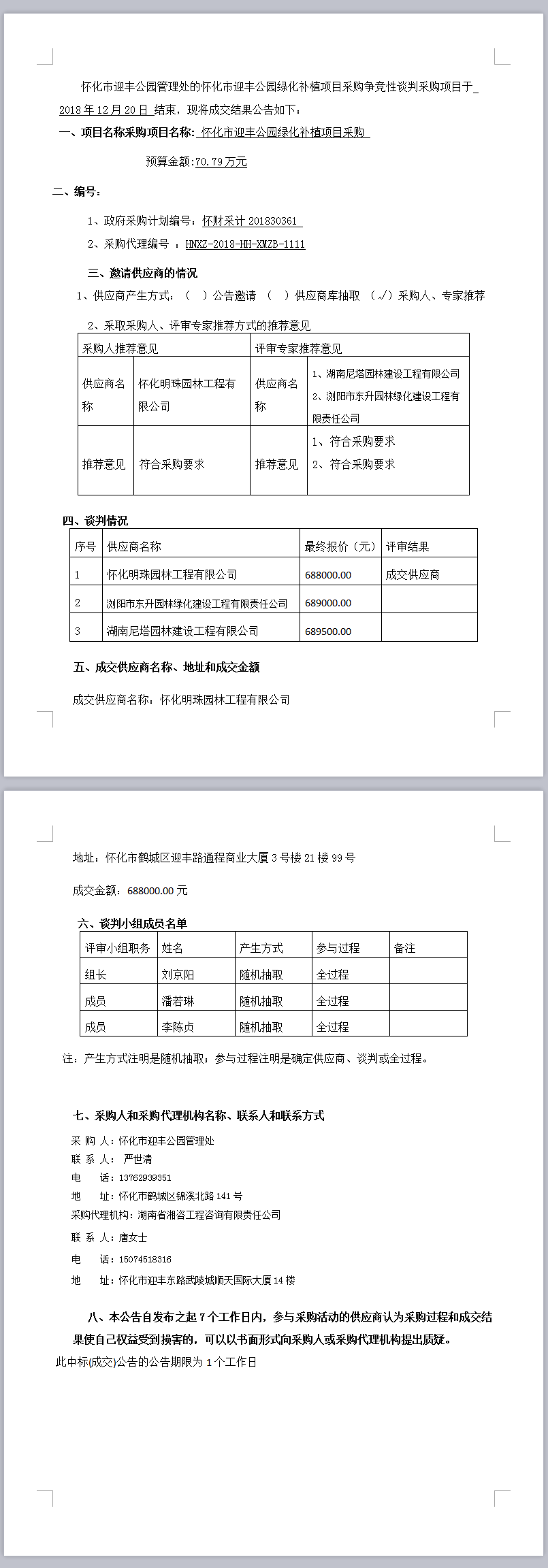 懷化市迎豐公園綠化補(bǔ)植項目采購談判成交公告